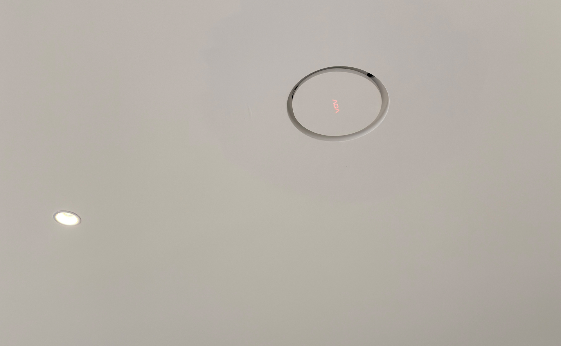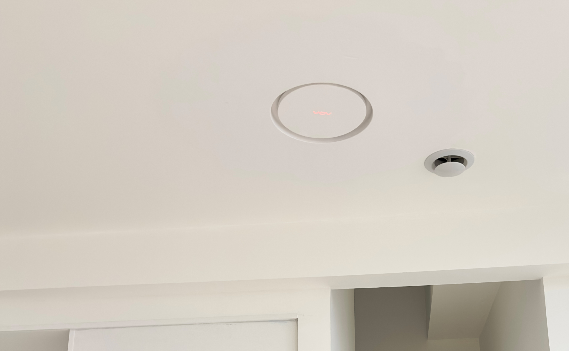I was terrified it’d ruin the vibe. “It’s flush with the ceiling,” the installer said, pressing a slim white disc into the drywall. I stared: it looked like a subtle design detail, not an appliance. The tiny red “VOV” logo only glows when it’s running (you have to squint to see it in the photos). “You won’t hear it,” he added. I laughed—my minimalist room amplifies every sound, from a pen dropping to a fridge hum.
