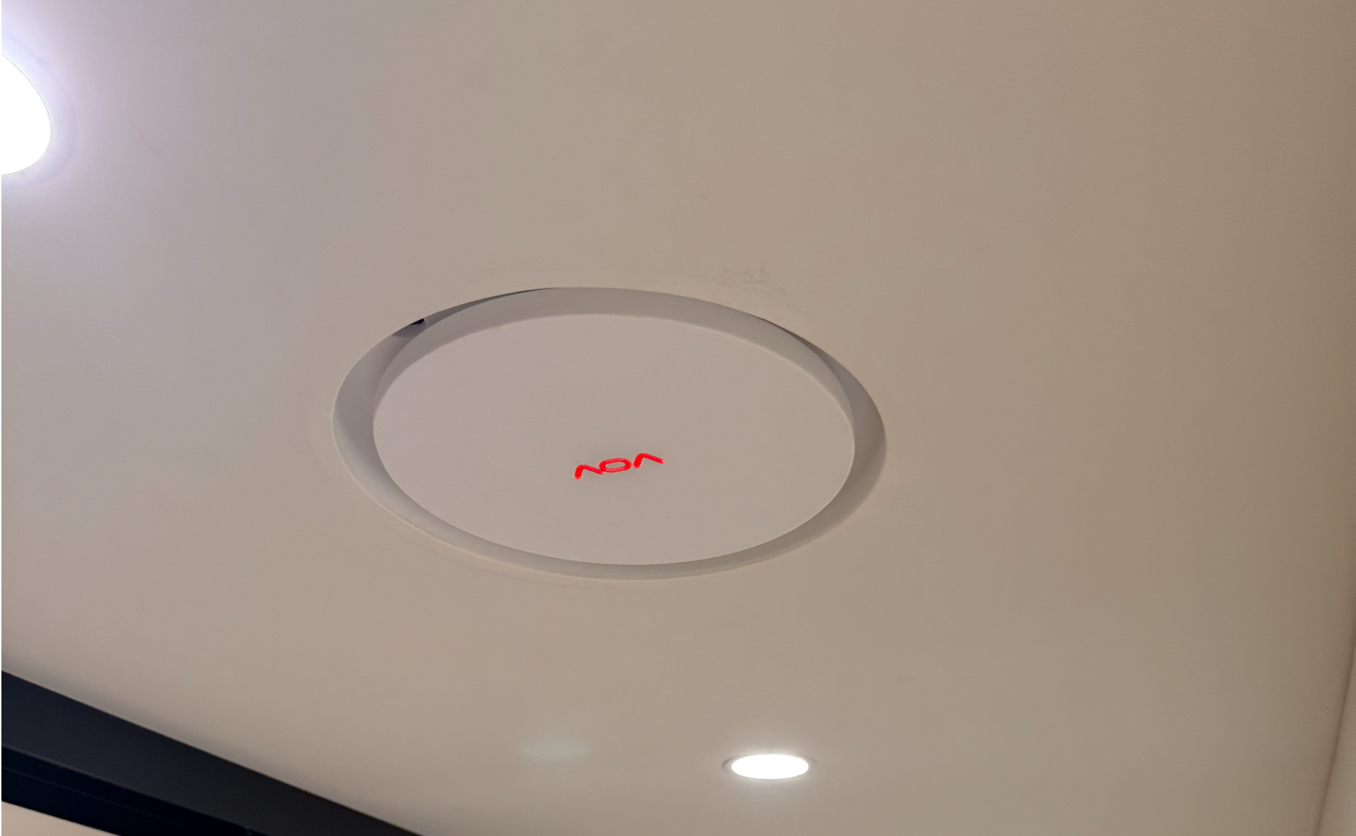 It started with the unboxing surprise: this thing wasn’t some clunky box I’d have to hide in a corner. It fit flush into my ceiling—just a minimalist white disc, with a tiny glowing logo (you can see it switching from yellow to red in the pics) that felt more “futuristic decor” than “appliance.” The installer laughed when I said I was worried it’d ruin my kitchen-living room open layout: “It’ll blend in so well, you’ll forget it’s there—until you breathe.”